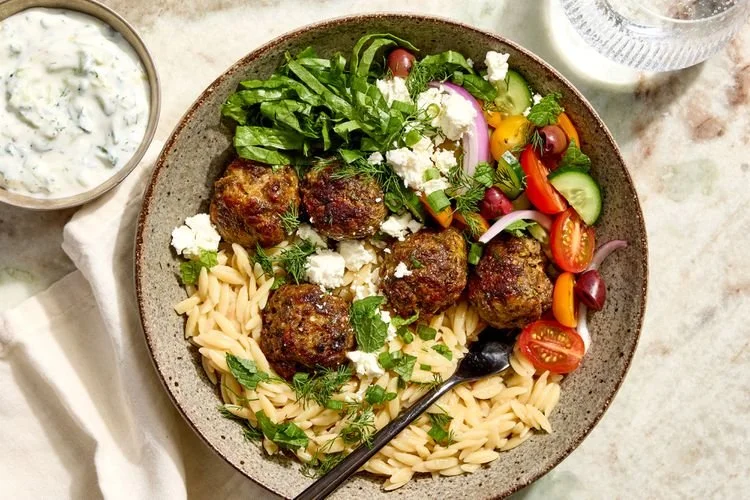 Divide cooked orzo or rice evenly among 4 bowls, top evenly with meatballs, chopped cucumber, tomatoes, onion, lettuce, feta and olives. Pour yogurt sauce over your bowl and enjoy!